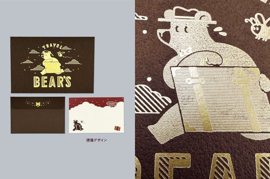 箔押し加工とは熱と圧力によって、紙に箔を圧着させる技法です。浮世絵の木版画を刷り上げていくように、1枚ずつ金属板をつくり、2度3度と箔を重ねて絵柄を完成させていきます。