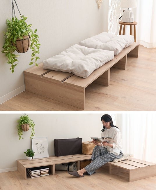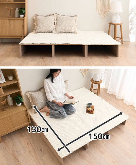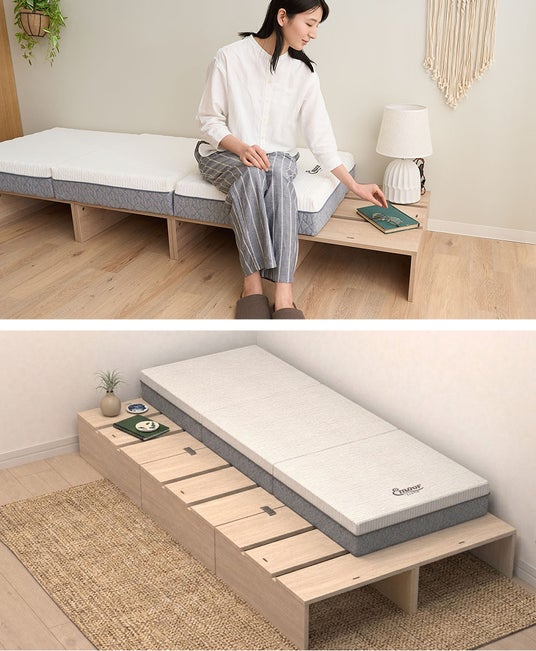 家族が増えたら、1セット買い足して並べればゆったりキングサイズ相当(約幅200cm)に変化。使わないときは重ねて部屋の隅へ移動することもできます。単身の方はもちろん、お子様のいるご家庭でも、子供の成長や夫婦の寝室の変化など、暮らしの変化に合わせて自在にレイアウトできます。