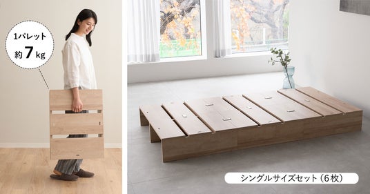 1セット6パレットでお届け。1パレットあたりは約7kgと重厚で、従来のパレットベッド(当社従来品)と比べて安心感と耐久性があります。1パレットずつ移動すれば女性ひとりでも無理なく動かすことができ、引っ越しや模様替えもスムーズです。