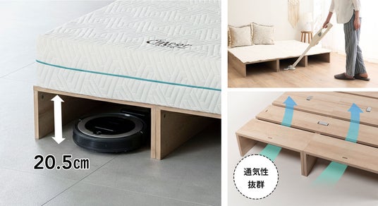 ベッド下にはしっかり高さを確保。掃除機が奥まで入る構造で、ロボット掃除機もスムーズに通れます。また、ベッド床面はすのこ状で空気が通りやすい設計に。湿気がこもりにくく、カビなどでマットレスを痛めにくく、1年を通して清潔で快適に眠れます。
