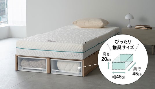 ベッド下には、約幅45cm×奥行45cm×高さ20cmの収納ケースがぴったり収まるサイズを確保。衣類や季節物、リネン類などをすっきり整理でき、限られた住空間を無駄なく使えます。