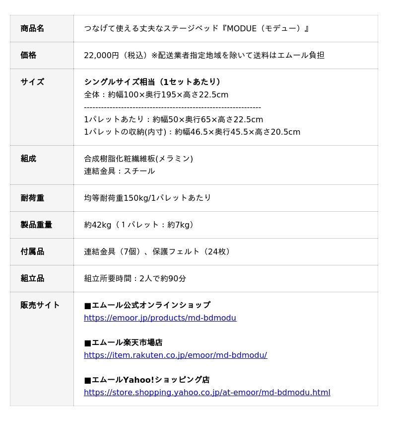 「身体に合った寝る・座る・たたむ」を提供する健康家具ブランドEMOORを展開する株式会社エムール(東京都立川市:代表取締役 高橋 幸司/以下、エムール)は、2026年3月3日より、つなげて使える 丈夫なステージベッド『MODUE(モデュー)』(以下、MODUE (モデュー) )の販売を開始しました。