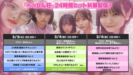 3月3日(火)20時より『べっぴん荘』リリースの瞬間をユーザーの皆様と共に迎えるべく、またべっぴん荘のヒットを祈願して、SteamストアページおよびYouTube「AimingMovies」にて24時間ヒット祈願生放送を実施しております。配信には『べっぴん荘』出演キャストや開発スタッフが登場し、タイトルの魅力を深掘りする紹介コーナーや制作の舞台裏、ヒット祈願企画など盛りだくさんの内容でお届け中。