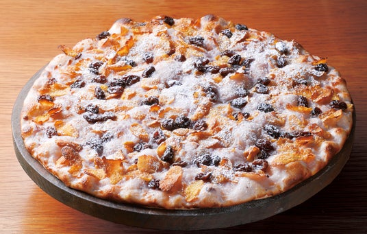 ・ ホワイトチョコソースとレーズンのピザ