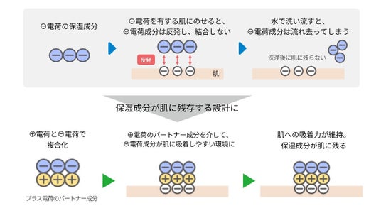 シロキクラゲ多糖体は保湿成分として様々なスキンケア商品にも活用されています。しかし、肌と同じ⊖の電荷を持つという特性から、肌と反発してしまい、洗顔料中にある保湿成分が洗浄後に留まりにくいという課題がありました。そこで、⊖電荷を持つ保湿成分に⊕の電荷を有する他の成分を複合化することで、電気的反発を抑制し、洗浄後の肌に保湿成分を留める設計に。