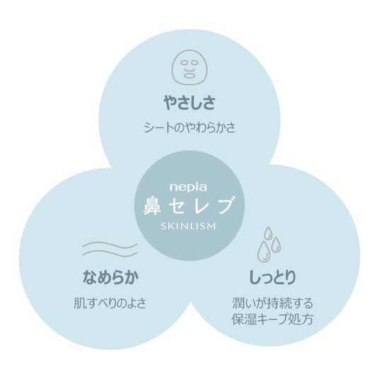 この度発売となる「ネピア 鼻セレブ SKINLISM 美容液マスク」では、鼻セレブティシュで培ってきたこの3要素をシートマスク設計に落とし込み、低刺激でありながら、うるおいと心地よさを兼ね備えた使用感を実現しました。