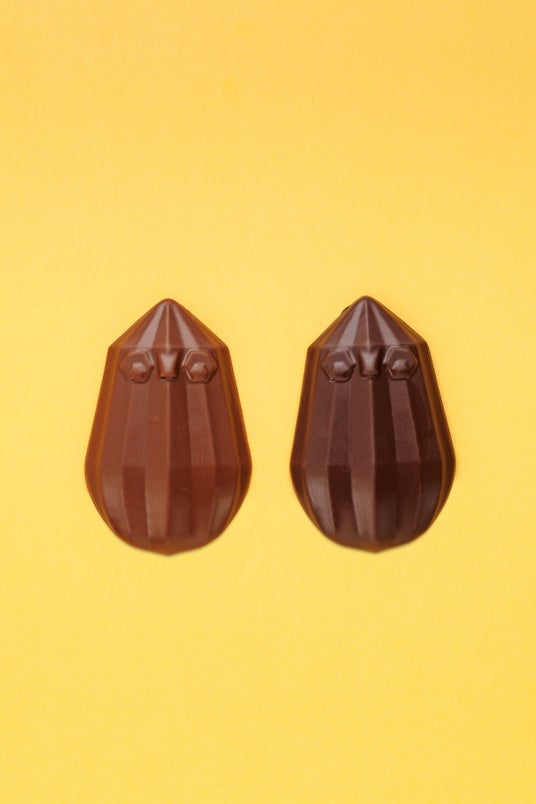 カカオポッドを模ったペピットショコラ。キャラメルとヘーゼルナッツのプラリネを層にしヘーゼルナッツを丸ごと一粒忍ばせたショコラ ノワールと、ココナッツのプラリネの詰まったショコラ オ・レの2種類をお楽しみいただけます。