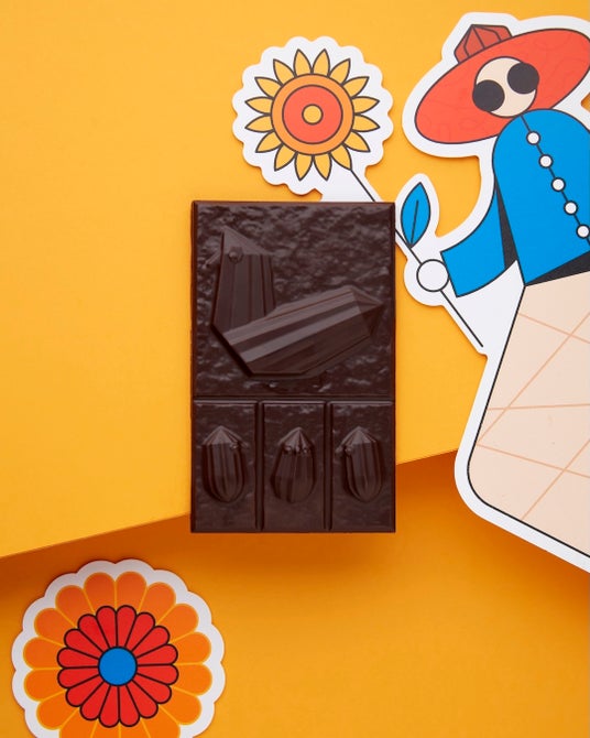 ニワトリやヒヨコが描かれたタブレットショコラ。中にはザクザクとしたひまわりの種のプラリネを閉じ込めました。