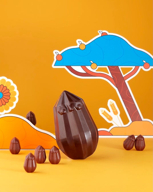 印象的なオレンジ色のパッケージデザインは、パリやカナダでも高い評価を受けるイラストレーター オーレリアン・ジェニーによるもの。カカオポッドの生命力を想起させる色彩が、イースターの祝祭を鮮やかに彩ります。