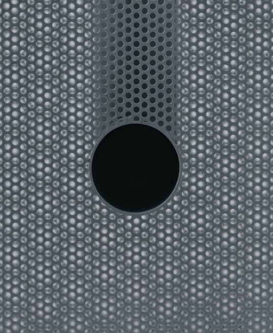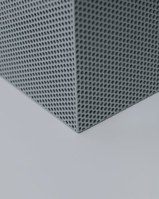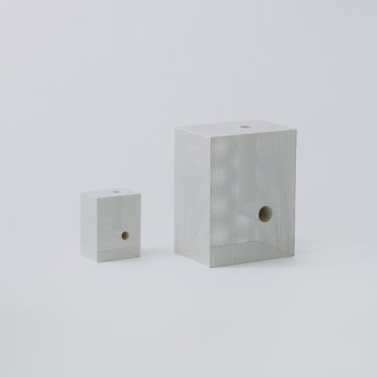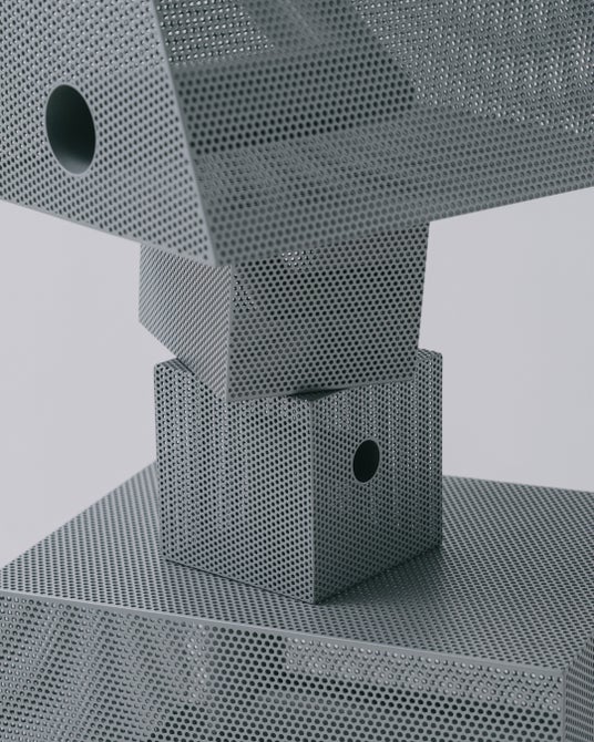 パンチングメタルは本来、軽量化や通気性など機能性を目的に発展してきた素材ですが、見る角度や光によって印象が変わる曖昧さも併せ持ちます。「Punching Block(パンチングブロック)」では、その機能ではなく“見え方の揺らぎ”に着目し、箱状に組んだパンチングメタルにL字型パイプを貫通させた構成としました。高精度な板金・溶接技術と均一な塗装によって、外観は塊として立ち上がりながら、内部構造が光や視点によって断片的に現れます。