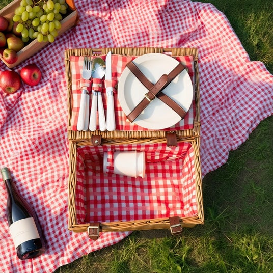 この『ピクニックセット』は、持ち手のついたレトロなバスケットと、その中に収納された2人用のカップ、プレート、スプーン、ナイフ、フォークがセットになった、”オールインワン”のピクニックグッズです。