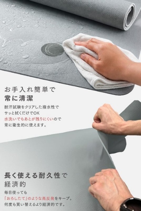 繰り返しの使用でも弾力を保ちやすい耐久性と、汗や水分を拭き取りやすい撥水仕様により、清潔な状態で利用いただくことができます。繰り返しの使用でも、弾力を保ちやすい耐久性を備えています。