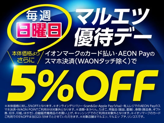 マルエツではイオンマークのクレジットカードをご利用のお客さまを対象に、毎週日曜日のお買い物がおトクになる独自の優待施策を実施しています。