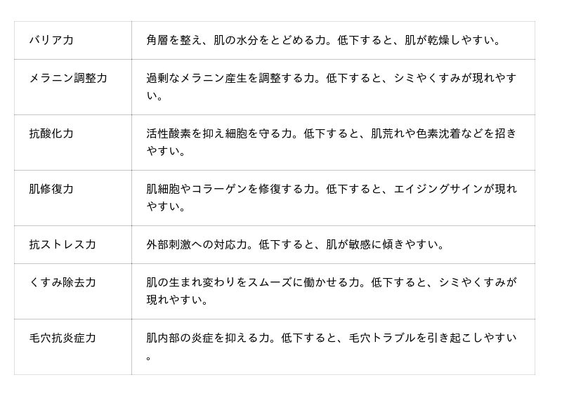 – 本解析は一般的に行われる肌測定とは異なり、角層から得られるその人だけの肌の情報を解析するという当社独自の解析方法です。肌表面の角層を専用テープで採取し、「角層のカタチ・大きさ」と「肌の美しさに関わるタンパク質」を独自の計算式をかけ合わせて解析します。解析結果を「7つの肌力」として算出し、現在の肌状態に加えて将来なりやすい肌トラブルの傾向が分かります。