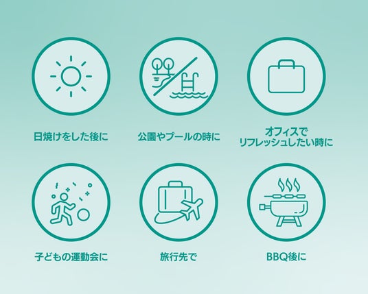 公園やイベント時など屋外で長時間過ごした後のアフターケアや、BBQなどでの暑さ対策としてはもちろん、オフィスでのリフレッシュにもおすすめです。