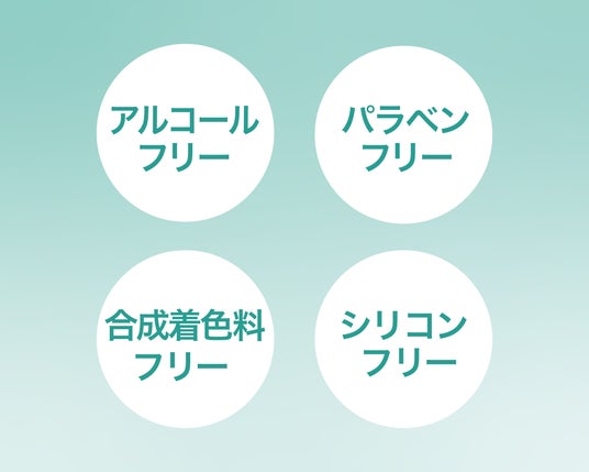 (アルコールフリー、パラベンフリー、合成着色料フリー、シリコンフリー)