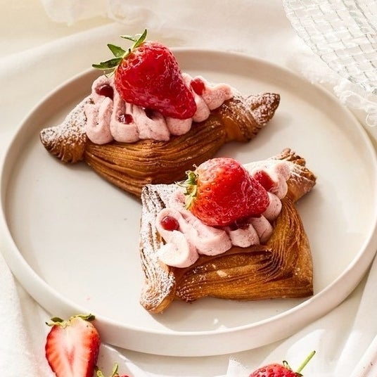 さっくりデニッシュ生地にいちごホイップ、フレッシュいちごをトッピングしました。ザクザク触感のデニッシュといちごのハーモニーをお楽しみください。