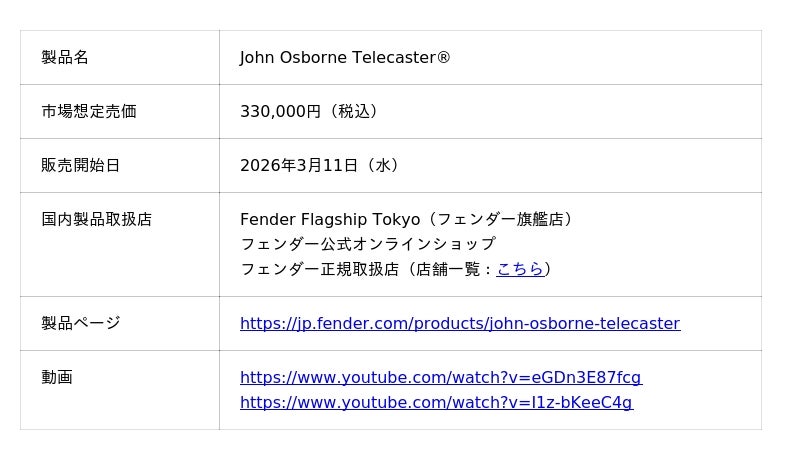 フェンダー ミュージカル インストゥルメンツ コーポレーション(所在地:米国カリフォルニア州、CEO:エドワード・バド・コール、以下FMIC)は、グラミー賞受賞ギタリスト、ジョン・オズボーンのシグネイチャーモデル『John Osborne Telecaster(R)』を発表しました。本製品は、2026年3月11日(水)より販売を開始します。