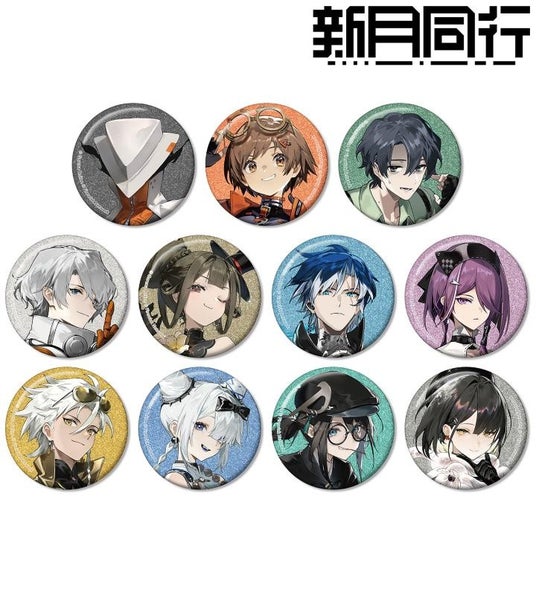 隊長、千秋、家泉、浄天、荔傾、飲火、レイン、ヤヌス、碎銀子、スズメ、結のイラストをグリッター加工を施した缶バッジに仕上げました。