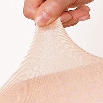 摩耗耐久回数1万回以上達成の強い生地を採用することに加え、生地を引き上げるときに指の力がかかるウエストからふとももの途中までを従来品ストッキングの約2倍の厚さにして補強。更に、つま先から破れることを防ぐためトウ部分を従来品ストッキングの約1.5倍の厚さに補強しています。