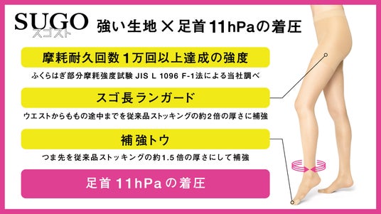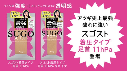 アツギ株式会社(本社:神奈川県海老名市、代表取締役社長:日光信二)は、2026年春夏シーズンの新商品として、アツギ史上最強 破れに強い新次元レッグウェアブランド「スゴスト」より「スゴスト着圧タイプ足首11hPa」を発売いたします。タイツの強度とストッキングのような透明感というスゴストの特徴はそのままに、足首11hPaの着圧で脚もとを引き締めます。この商品にはアツギ株式会社と東レ株式会社(本社:東京都中央区、代表取締役社長:大矢 光雄、以下「東レ」)が共同で開発した新素材を使用しています 。