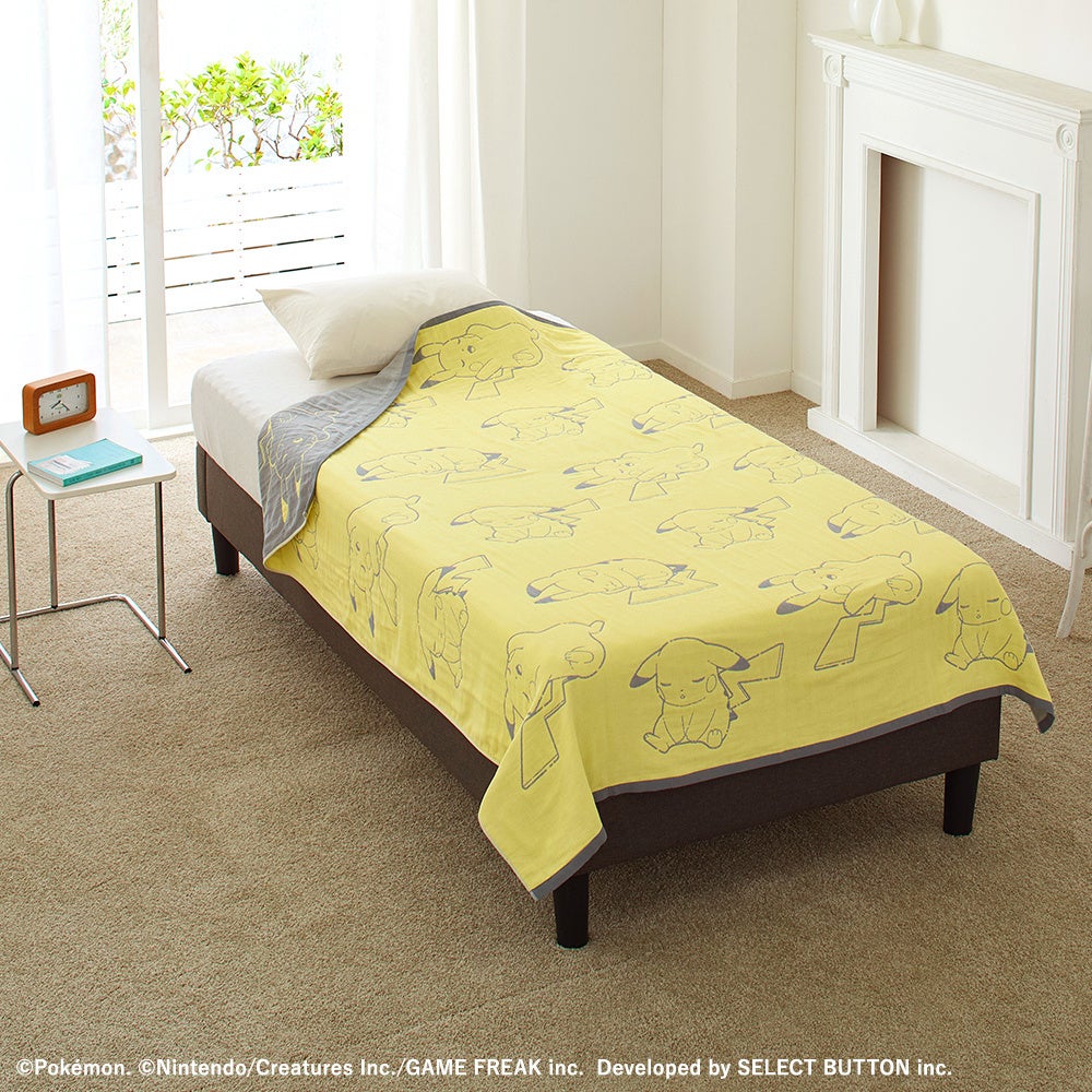 通気性・吸水性に優れた天然素材。洗うたびに肌になじむふんわりとした質感とたくさんのピカチュウの姿に囲まれて眠れます。ハーフケットもラインアップ。