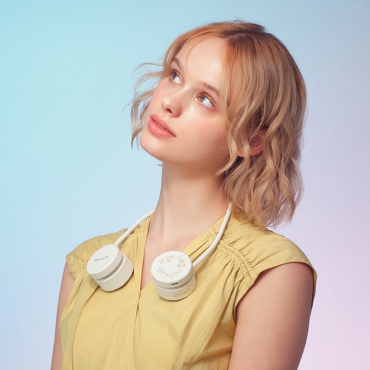 手ぶらで涼しく、両手が自由に使える首掛けタイプのネックファン。髪を巻き込みにくい羽根なし設計。ネックバンドはくるくる巻いてコンパクトに収納でき、持ち運びに便利なポーチ付きです。