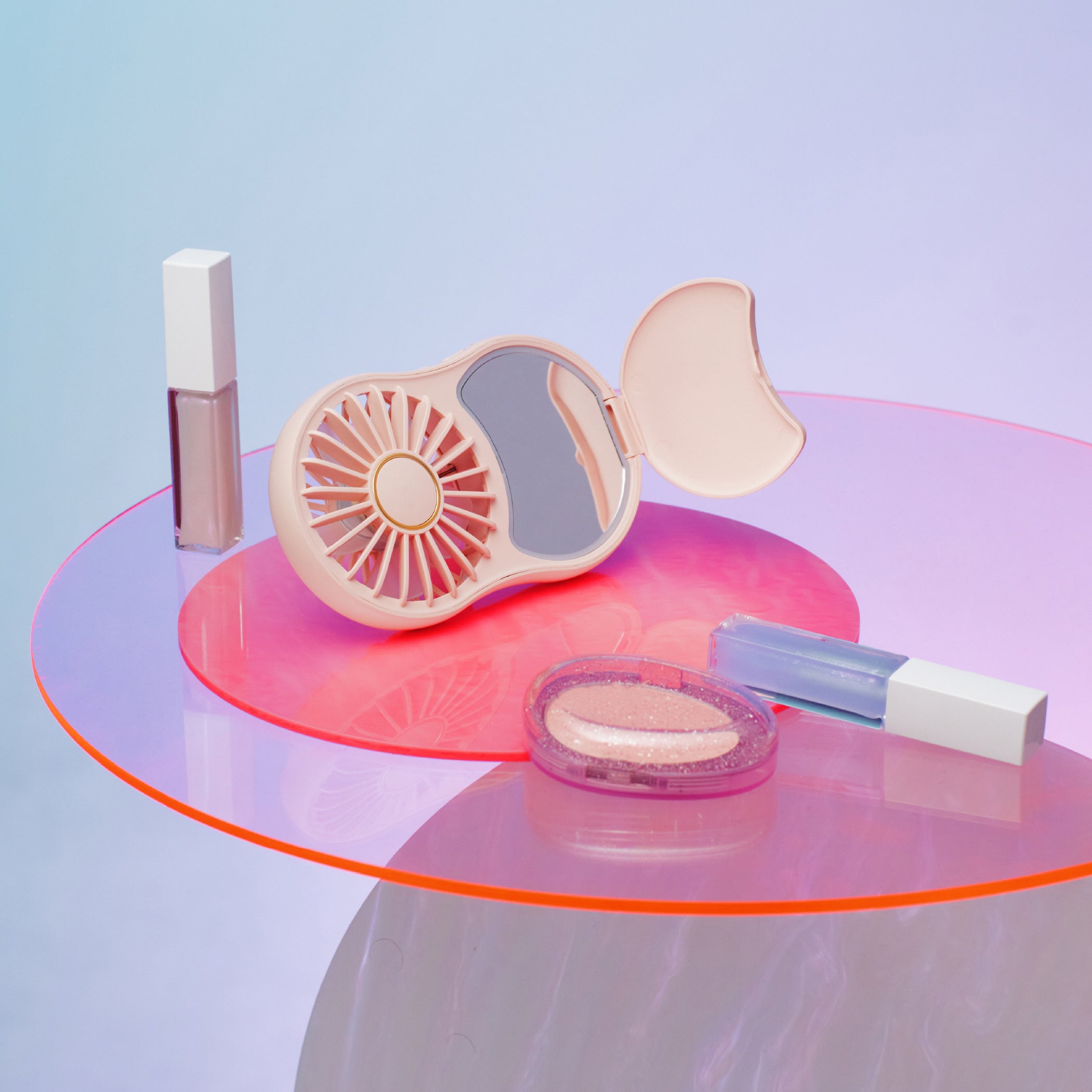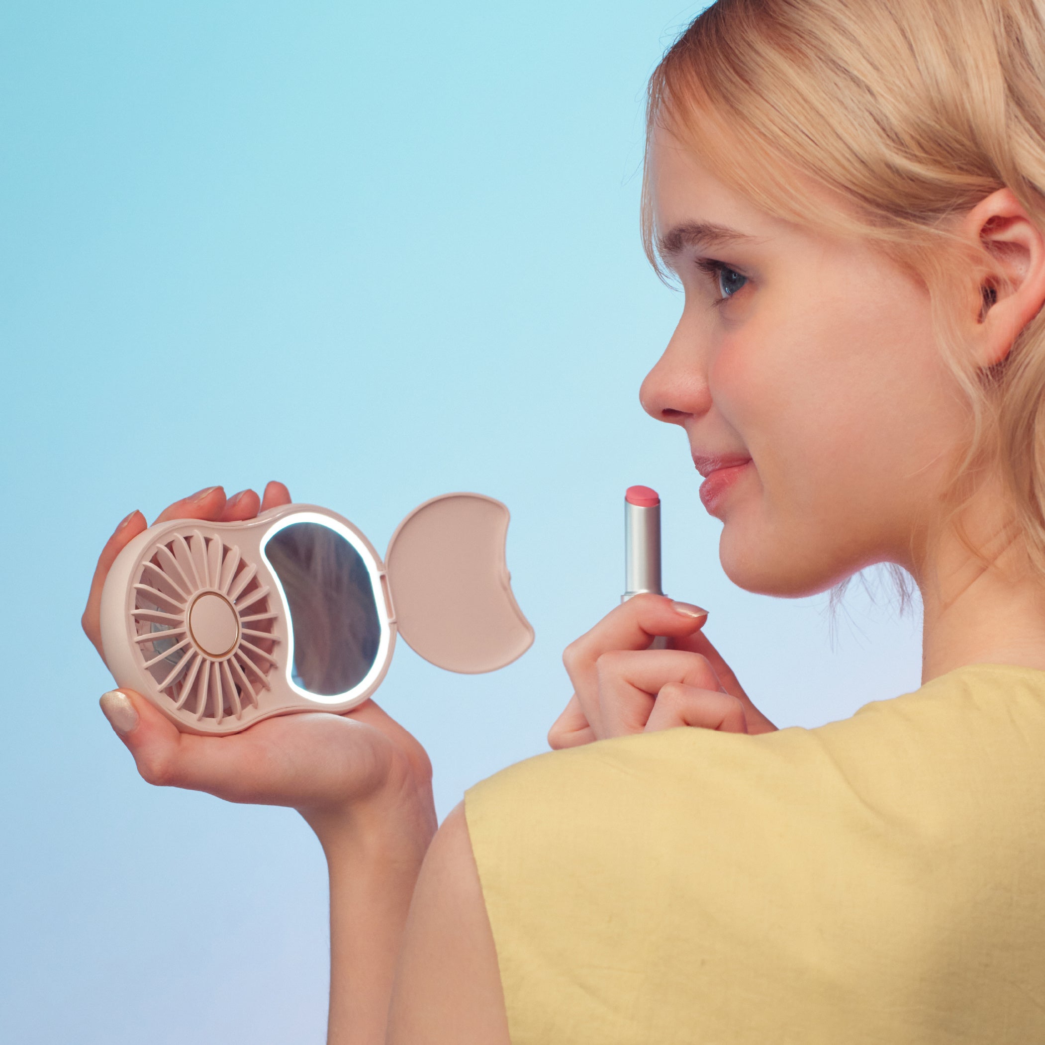 風とミラーで身だしなみも整う、ミラー付きハンディファンが登場。涼しい風を浴びながら、メイクやヘアスタイルをさりげなくチェックできます。暗い場所でも使いやすいライト付きで、外出先でも安心です。