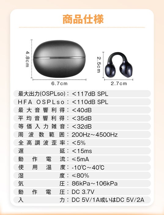 従来の耳穴挿入型ではなく、耳に軽く掛けるイヤーカフ型デザインを採用。圧迫感を軽減し、長時間使用でも快適に装着できるよう配慮しました。見た目も目立ちにくく、外出時にも使用しやすい設計です。