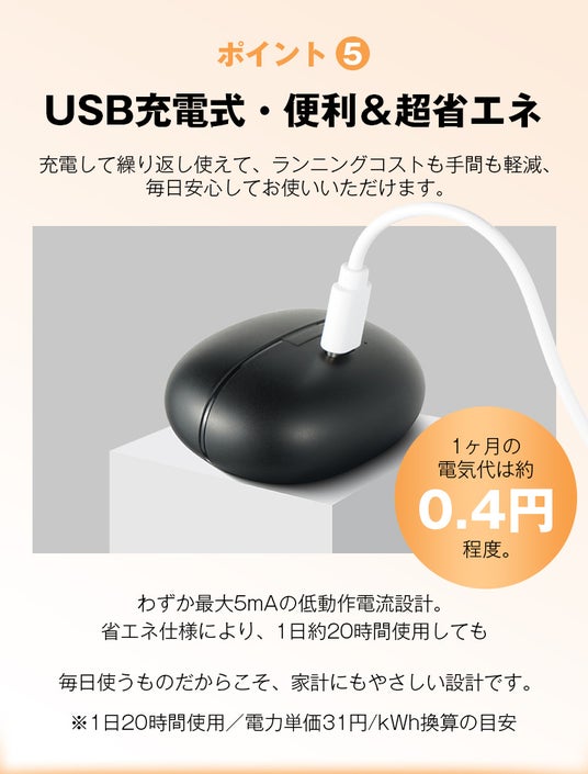 さらに省エネ設計で、1日約20時間使用しても1ヶ月の電気代は約0.4円程度です。