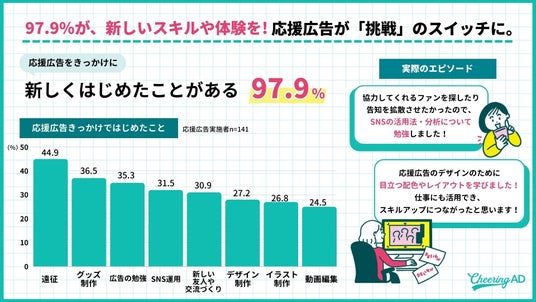 実際に、応援広告をきっかけに新しいことを始めた人は97.9%に達し、広告を見に行くためなどを目的に初めて「遠征」をしたファンは44.9%に達しました。他にもグッズ制作や広告の勉強、SNS運用など、「応援したい」という純粋な動機が、結果としてファンの経験やスキルの幅を広げる豊かなきっかけとなっています。