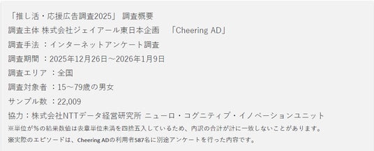 株式会社ジェイアール東日本企画(本社:東京都渋谷区、代表取締役社長:石川 明彦)が運営する応援広告事務局「Cheering AD(チアリングアド)」は、全国15~79歳の男女22,009人を対象に、今年で4年連続となる「応援広告・推し活調査」を実施しました。