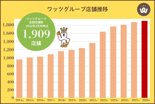 ワッツは2014年より店舗数を全国各地において増加させており、2026年2月末時点にて、全国店舗数1,909店舗を達成いたしました。今後も皆様に便利な日用品・生活雑貨をお届けするため、全国各地に積極的な新規出店を計画しています。