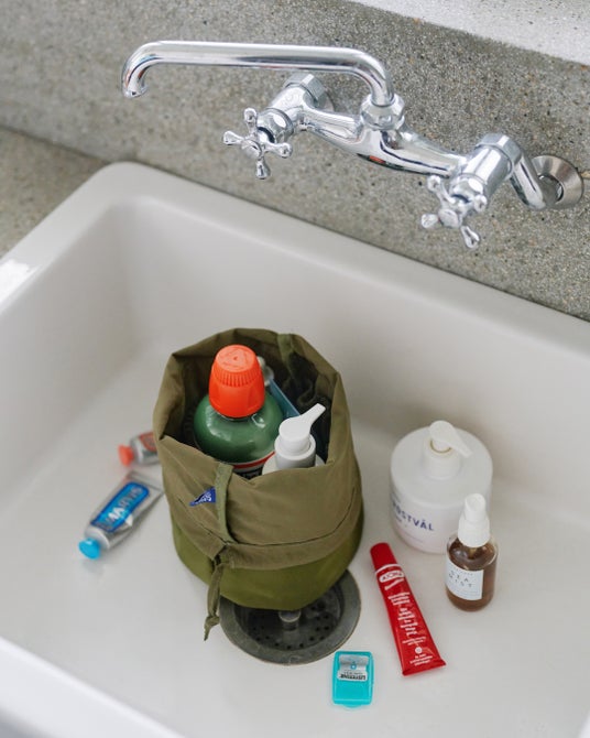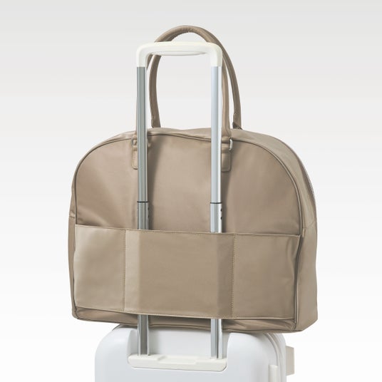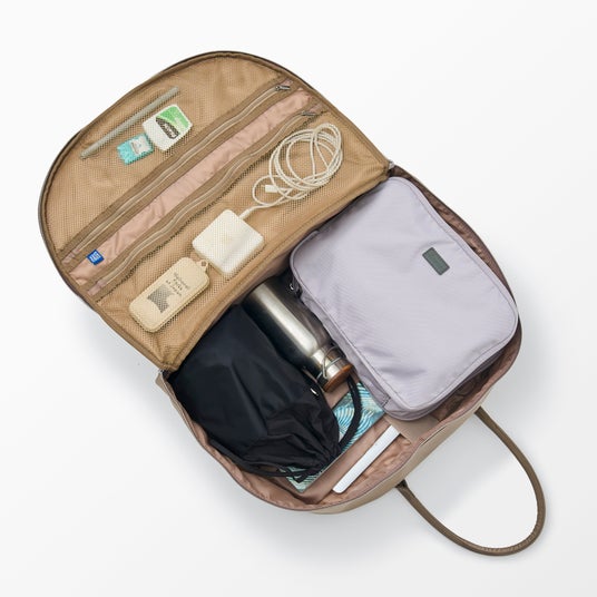 ポーチは、スキンケア用品やボトル類を立てたまま収納できるスタンドタイプ。中身が見やすく出し入れしやすい設計で、内側には複数のポケットを備え、ブラシや小物などを整理しやすい仕様です。別売りのストラップを取り付けることで、ミニバッグとしても使用可能。水筒やペットボトルを立てたまま収納でき、旅行時だけでなく日常の外出にも活躍します。