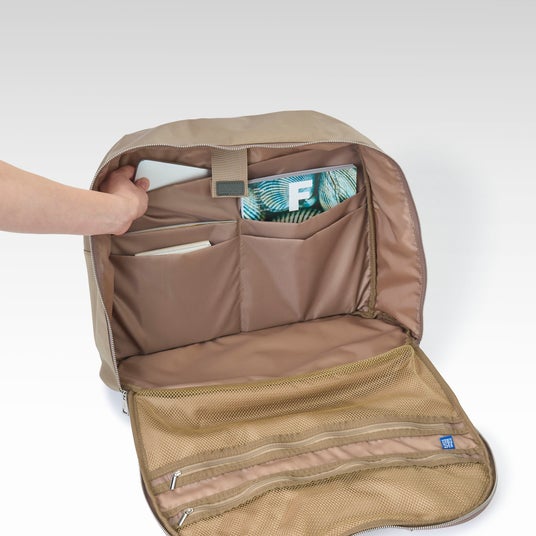 特徴:廃漁網再生ナイロン / 全開ファスナー / 16インチPC収納 / 多機能ポケット / 底鋲つき / キャリーバー装着
