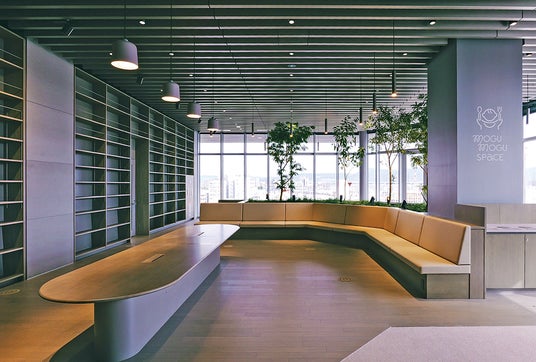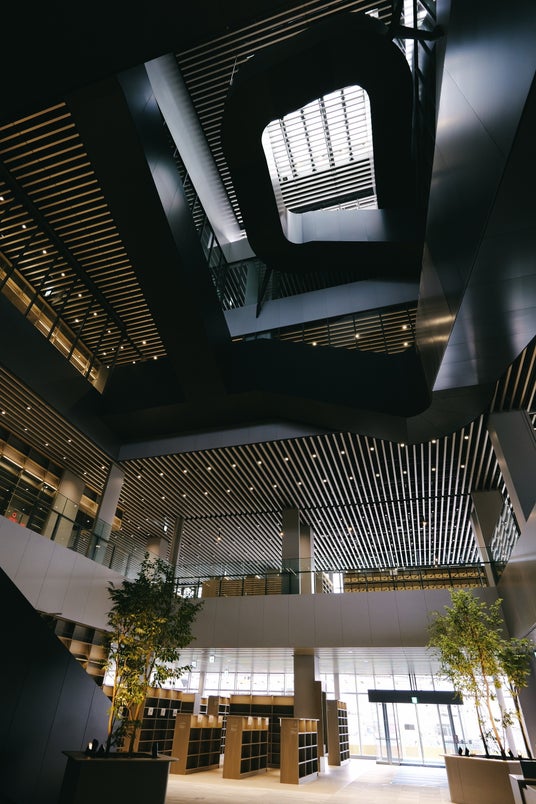 この建物には、建物の外周部を屋上まで歩いていくことが可能な「スパイラルガーデン」と、建物中央の吹抜けに設置されて各階を繋ぐ「ギャラリーウォーク」という2つの動線が設けられています。建物の各階に点在する「図書館」と「生涯学習」を核とした様々な機能が、この2つのらせん階段をコアにして、屋内と屋外をシームレスに繋げています。
