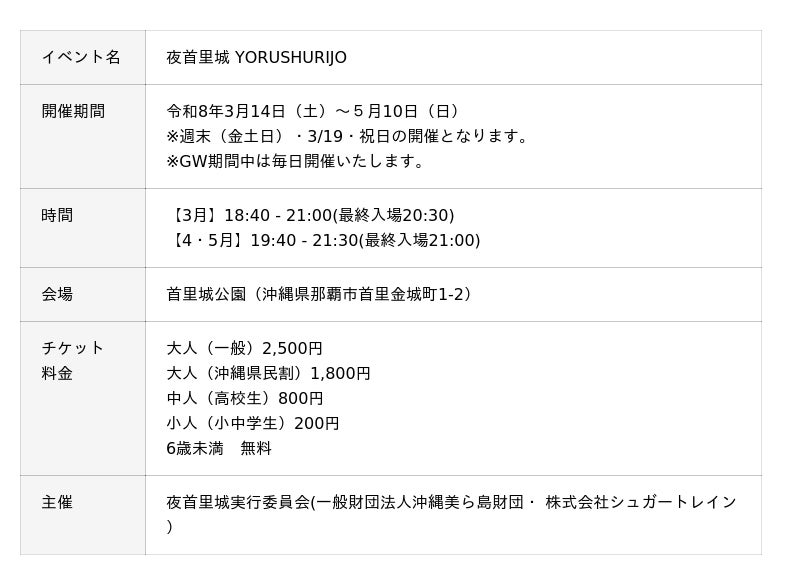 2026年3月14日(土)から5月10日(日)までの期間、夜首里城実行委員会(一般財団法人沖縄美ら島財団・ 株式会社シュガートレイン)は、首里城公園にて夜間特別イベント「夜首里城 YORUSHURIJO」を開催いたします。本イベントは、夜の首里城をライトアップやプロジェクションマッピングなどの光で彩る