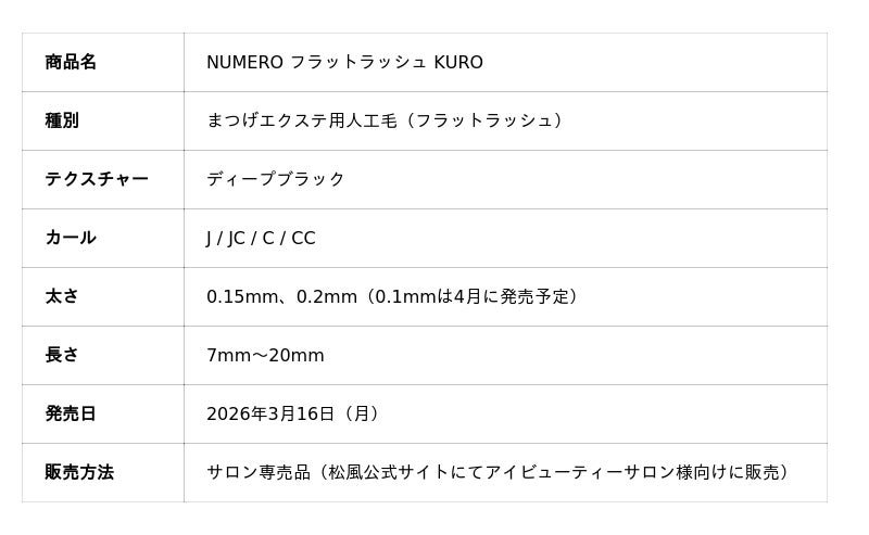 まつげエクステンション商材をはじめとするアイビューティー商材の製造・販売を手がける株式会社松風(本社:大阪府大阪市、代表取締役:廣岡孝繁)は、まつげエクステ用フラットラッシュ人工毛「NUMERO KURO(ヌメロ クロ)」を2026年3月16日(月)より発売いたします。本製品は、NUMEROブランドの人気シリーズ「NUMEROフラット マットブラック」の後継モデルとして、色味・質感・整列精度のすべてを刷新した新世代のブラックフラットラッシュです。