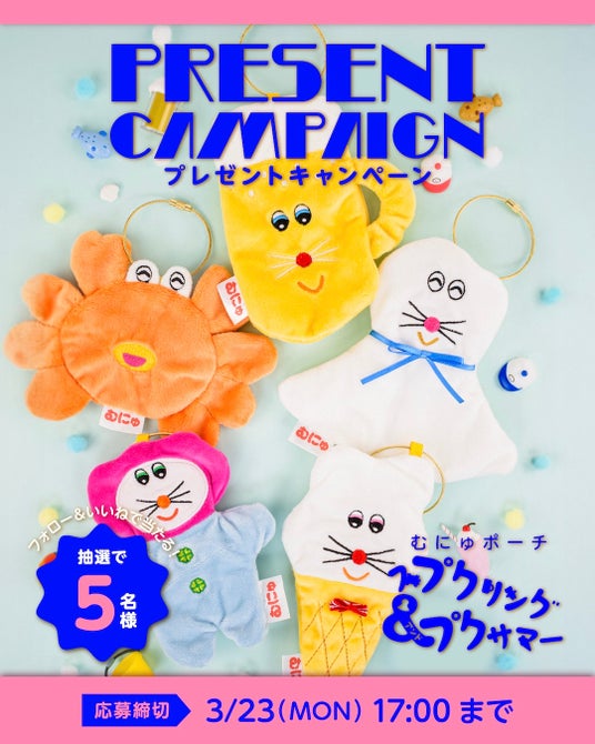 さらに、発売を記念してKENELESTANDの公式Instagram(@kenelestand)をフォローし、キャンペーン投稿を「いいね」した人の中から抽選で5名様に、『むにゅポーチ スプクリング&プクサマー』コンプリートセットをプレゼントするキャンペーンを、2026年3月16日(月)12:00~3月23日(月)17:00まで実施いたします。