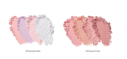 09 Seaside Mist:白を溶かし込んだソフトマットなモーブとベビーピンクにクリアなガラスパールがきらめくソルベカラーをセット。涼やかな透明感が際立つヘイジーパステルパレット