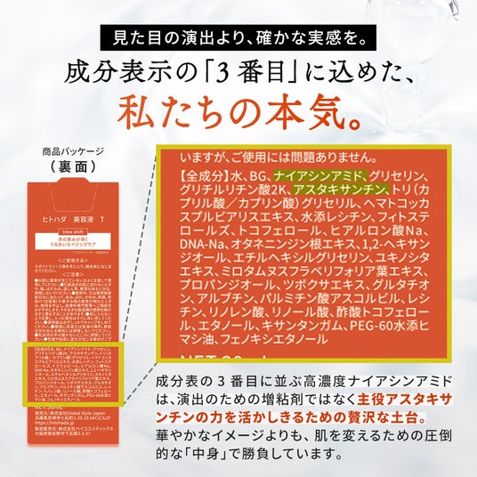 華やかな演出のためではなく、アスタキサンチンを活かす土台として「ナイアシンアミド」を成分表示の3番目に高配合しました。