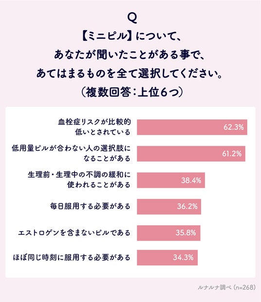 最も多い回答は「血栓症リスクが比較的低いとされている」62.3%、次いで「低用量ピルが合わない人の選択肢になることがある」61.2%となりました。