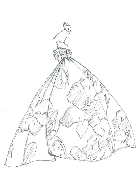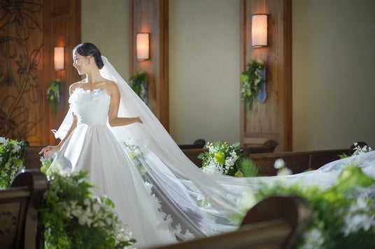木目調が特徴的なカウイチャペルをイメージして、デザインされたドレス。ミカドサテン特有の上品な艶感と、圧倒的なシルエットがチャペルの洗練された空間と美しく調和します。