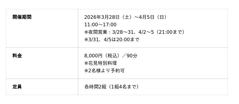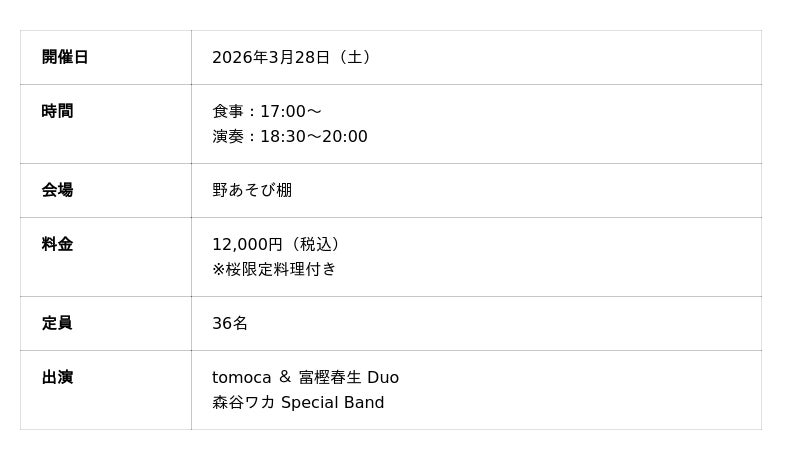 当日は、桜をテーマにした特別料理を楽しんだ後、オーボエやピアノによる演奏、ジャズバンドのライブなどをお届けします。