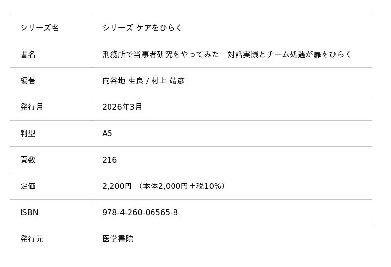 株式会社医学書院 (所在地:東京都文京区、代表取締役社長:金原 俊)は、『シリーズケアをひらく』最新刊『刑務所で当事者研究をやってみた 対話実践とチーム処遇が扉をひらく』(編著:向谷地生良、村上靖彦)を2026年3月9日に刊行しました。