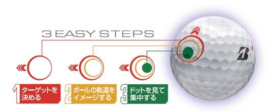 同商品の独自マークデザインは、当社ボール契約のジェイソン・デイのメンタルコーチとともに開発したもので、ショット前のルーティンとなる 「ターゲットを決める」、「ボール軌道をイメージする」、「集中力を高める」という3ステップをよりスムーズに行えるようデザインされています。また、方向性をサポートする機能も搭載しており、イメージ通りのショット※1へと導きます。また、当社契約のクリス・ゴッターアップが、このマークの入ったボールを使用しPGAツアーですでに2勝を挙げており、より一層上達を目指すマインドを持つゴルファーにおすすめの商品です。