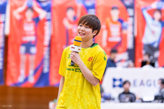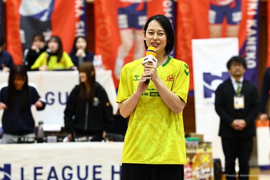 国際女性デーの関連イベントとして、来場したリーグH理事の大山加奈さんは、選手たちに「みなさんの持っている力強さと、そして美しさを、思いっきり発揮してほしい」とエールを送りました。ハーフタイムには、アランマーレ富山OGで競輪選手を目指す菊池杏菜さんとのトークショーが行われました。