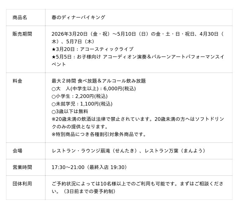 3/20~5/10の金・土・日・祝日に開催。歓送迎会や春の集まりに利用できる2時間制バイキング。