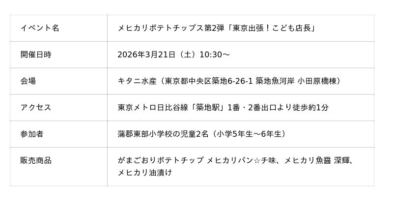 有限会社まんてん.(本社:愛知県豊橋市神野新田町字ヲノ割40-1、代表取締役:黒田 孝弘)は、2026年3月21日(土)東京・築地魚河岸内のキタニ水産(東京都中央区築地6-26-1 小田原橋棟)にて、メヒカリポテトチップス第2弾企画「東京出張!こども店長」を開催いたします。愛知県蒲郡市の特産品・深海魚メヒカリの魚醤を使った「がまごおりポテトチップ メヒカリパン☆チ味」を開発した蒲郡東部小学校の児童2名が「こども店長」として店頭に立ち、蒲郡の地魚であるメヒカリを起点にしたメヒカリポテトチップスやその他メヒカリ商品を販売します。