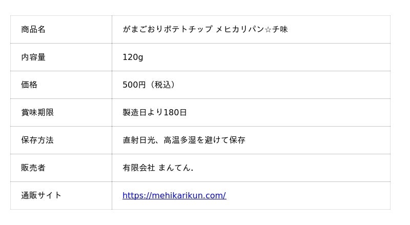 「がまごおりポテトチップ メヒカリパン☆チ味」には、他にはない特徴があります。